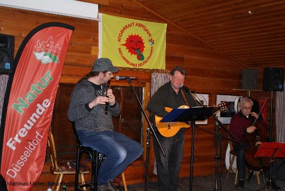 50 Besucherinnen und Besucher durften an diesem Sonntagnachmittag im Naturfreundehaus Gerresheim eine Premiere erleben: Klaus Grabenhorst (Gitarre, Gesang), Max Maxelon (Cello) und Jens Barabasch (Flöten) präsentierten zum ersten Mal das neue Programm "Hommage an Walter Mossmann". Mit vielen seiner Lieder, aber auch mit Auszügen aus seiner Biographie und mit eigenen Erzählungen erwiesen die drei Musiker dem im vorigen Jahr verstorbenen Liedermacher der Anti-Atom-Bewegung ihre Referenz.