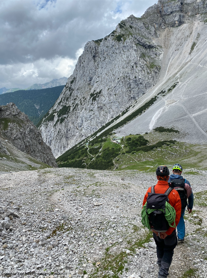 Der Soldatenweg war unser Ziel. Pünktlich starteten wir am Wanderparkplatz Richtung Dammkarhütte. Kaum gestartet setzte auch schon starker Regen ein. Dank guter Tourenplanung waren wir entsprechend vorbereitet und konnten mit Regenkleidung die Tour fortführen. Doch am Einstieg zur Route war klar, bei dem Wetter ist an Klettern nicht zu denken. Auch das ist Teil der Ausbildung – Risikoeinschätzung und auch mal „abzubrechen“. So nutzten wir das Gebiet um die Dammkarhütte, um das Gehen in weglosen Gelände sowie das Abfahren im Geröll zu üben. Den Nachmittag verbrachten wir noch im Klettergarten Sonnenplatten, wo wir einige Mehrseillängen klettern konnte.