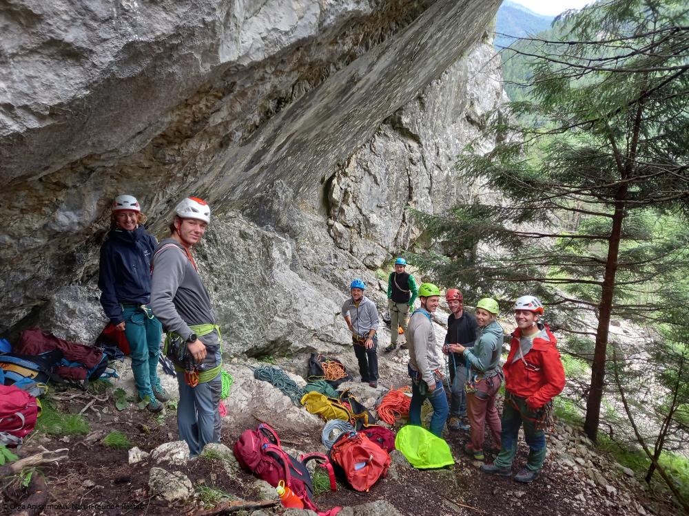 Beide Gruppen stiegen am nächsten Morgen durch eine wunderschöne Klamm mit etwas Kraxelei Richtung Einstieg zur Kletterroute auf. Da es vom Vortag noch rutschig und nass war, übten wir auch hier am Weg Sicherungstechniken. Nach einer kurzweiligen, aber sehr schönen Kletterei erreichten alle den Gipfel der Viererspitze und die Sonne begrüßte uns, sodass wir diesmal einen tollen Weitblick über das Karwendel genießen konnten. Dennoch hieß es dann nochmals fokussiert bleiben und über ein längeres Seilgeländer das Steinschlag gefährdete Gelände abklettern. Unten angekommen stärkten wir uns kurz an der Dammkarhütte und nahmen nochmal den letzten Abstieg in Angriff.