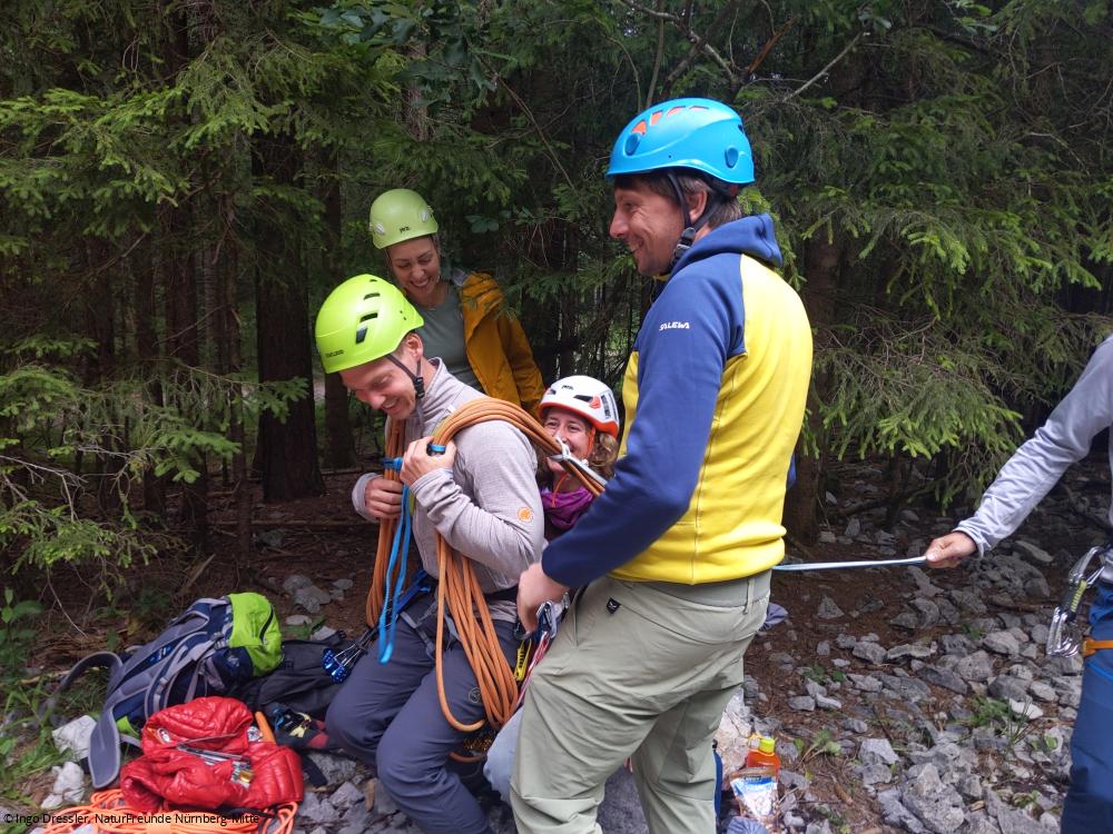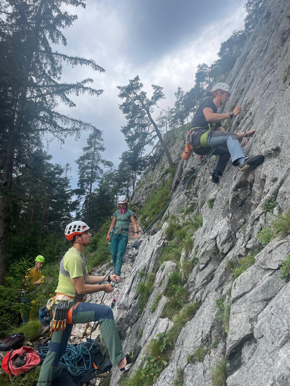 Für Montag stand Klettern auf dem Programm. Unsere Ausbilder*innen wollten erst mal sehen, wer welches Niveau mitbringt. Aufgrund von Regen in der Nacht gab es aber direkt eine Planänderung und wir gingen anstatt an das Flämenwandl in den neuen Klettergarten Sonnenplatte in Scharnitz. Knapp zwei Stunden später zwang uns der Regen dann leider auch hier zum Abbruch und wir fuhren nach einer kurzen Stärkung in den Bundeswehrklettergarten, welcher sich aufgrund seiner Haken und Begebenheiten sehr gut für die Ausbildung eignete. Dort übten wir dann in Gruppen verschiedene Sicherungs- und Abseiltechniken, unter anderem Standplatzbau, Schleifknoten, Seilgeländer, Ablassen und vieles mehr.