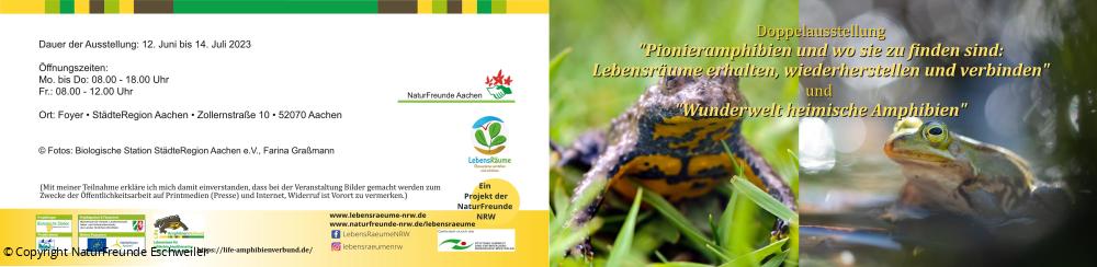 Die Fotoausstellung von Farina Grassmann tut dies anhand der hervorragenden Aufnahmen der Tiere und ihrer Umgebung._Die Ausstellung "Pionieramphibien und wo sie zu finden sind: Lebensräume erhalten, wiederherstellen und verbinden" des LIFE Amphibienverbund-Projekts der Biologischen Station StädteRegion Aachen klärt auf über drei ganz besondere Amphibienarten und die Maßnahmen, die unternommen werden, um die Vorkommen in unserer Region zu stärken und zu erhalten. Die drei Arten Geburtshelferkröte, Kreuzkröte und Gelbbauchunke sind europaweit geschützt, jedoch durch den stetigen Verlust an Lebensräumen in unserer Region und darüber hinaus selten geworden. Ursache für den starken Rückgang der Tiere ist der fortschreitende Verlust von geeigneten Lebensräumen. In aktiven und ehemaligen Steinbrüchen, Kiesgruben und auf den Bergehalden der nördlichen StädteRegion Aachen kommen die Arten noch vor, die Bestände sind aber zum Teil in ihrem Fortbestand auch hier bedroht.