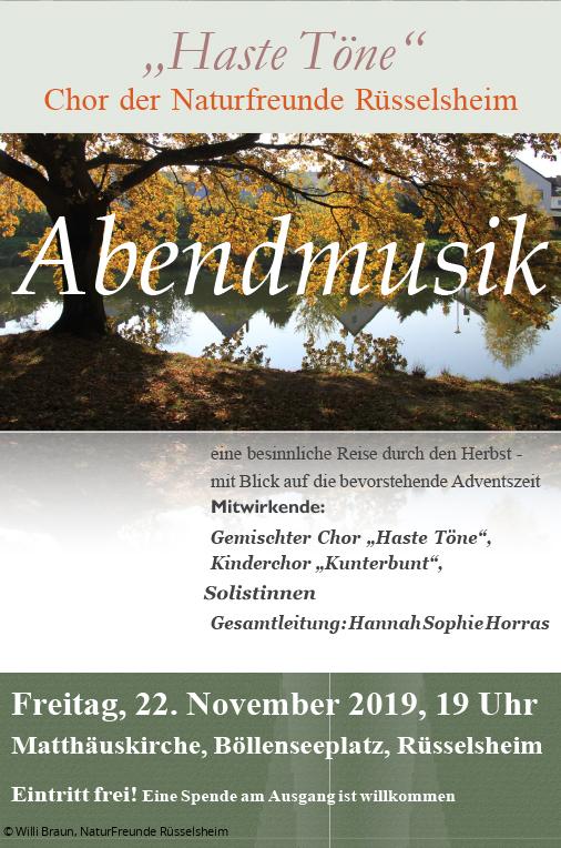 Das Verlorene ein Stück zurückzuholen ist den Akteur*innen ein besonders Anliegen. In der „Abendmusik“ in der Matthäuskirche am Böllenseeplatz erklingen besinnliche Melodien. Vertonte Gedichte von Matthias Claudius, Hoffmann von Fallersleben und vielen anderen präsentieren der Chor der NaturFreunde Rüsselsheim, „Haste Töne“, der Kinderchor „Kunterbunt“ von der anderen Rheinseite und Solist*innen. Das Band zwischen den Aufführenden wird gehalten von der Dirigentin und Gesangspädagogin Hannah Sophie Horras. Sie dirigiert die beiden Chöre und bei ihr erhalten die Solist*innen Gesangsunterricht.