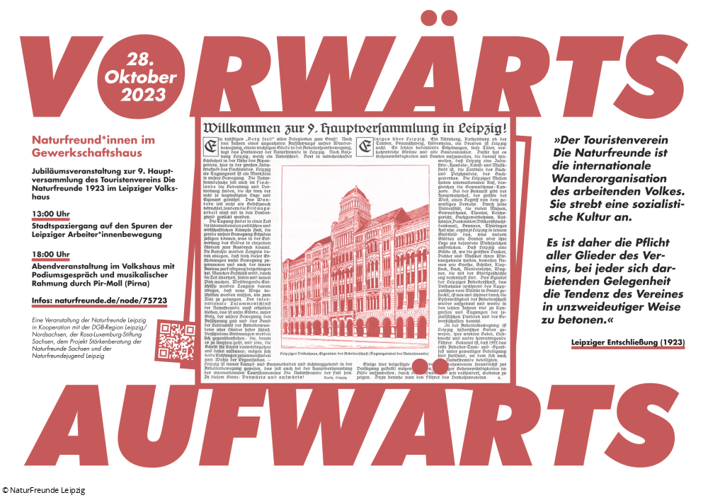 Diese Fragen wollen wir mit Gästen – u.a. aus der NaturFreunde- und der Gewerkschaftsbewegung – im Rahmen einer Veranstaltung am historischen Ort, dem Leipziger Volkshaus, am 28. Oktober 2023 diskutieren.